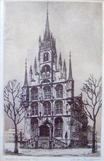 Originele ets “Stadhuis Gouda”. Gemaakt door Cornelis Marinus Van der WOERD, kunstschilder en -etser, zoon van Engelbartus Van der WOERD en Geertruida Lamberta Van der WERFF.