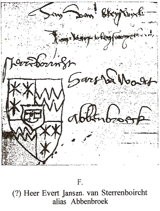 Bron: NL 1918, “Aanhangsel. Wapens en Zegels (Zie de Plaat).”, kolommen 263 en 264, “…Evert Jansz., hetwelk ook voorkomt in het oudste pachtboek. Dit wapen is gevierendeeld: 1 en 4 Starrensteyn., 2 en 3 Hart van der Woerd, met het genoemde hartschild (F.).” “Het wapen van de heerlijkheid Abbenbroek is een mansbroek.”.