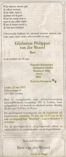Twee familieberichten in het Leidsch Dagblad van 25 mei 2013 over het overlijden en de begrafenis van Gijsbertus Philippus (Bert) Van der WOERD