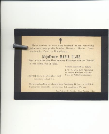 Overledenbericht van Maria ULJEE, dochter van Johannes Adrianus ULJEÉ en Pieternelletje De KLER. Gehuwd met Antonie Franciscus Van der WOERD of WOERDT?, 3e zoon van Johannes Van der WOERD en Elisabeth LANDA.
