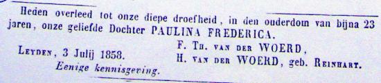 FB42.jpg Gepubliceerd op 1 juli 2021 in Paulina Frederica Van der WOERDVolledige resolutie (550 × 121) Overleden Paulina Frederica Van der WOERD (*1835 – +1858).